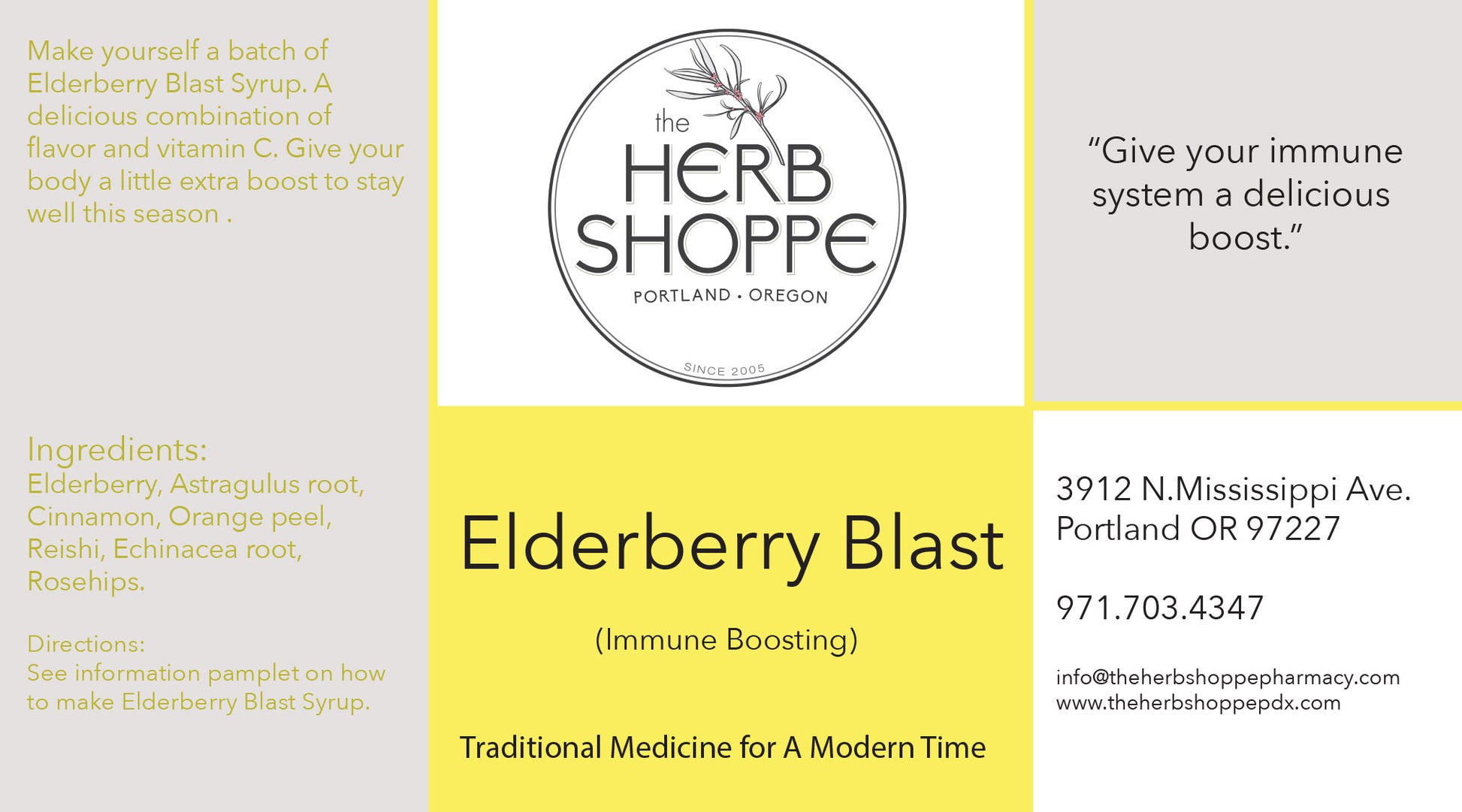 • Elderberries, Astragulus Rt, Cinnamon Bk, Orange Peel, Reishi, Echinacea Rt, Rosehips, Honey, Cane Alcohol, Apple Cider Vinegar, Distilled Water.